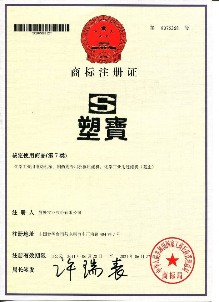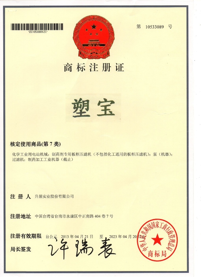 下列各式商標為本公司于大陸取得之商標注冊,僅授權太倉市塑寶環保機械及增城市升展機械公司使用,其余非經我司書面許可而濫用者,本公司將采取法律行動,追索侵權之損害賠償。